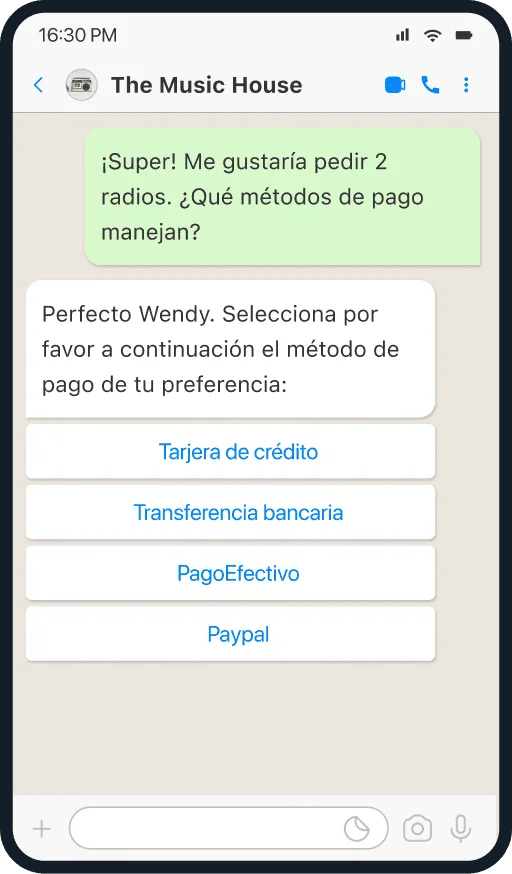 Ofrece a los clientes la opción de seleccionar su método de pago preferido para transacciones dentro de WhatsApp, simplificando el proceso de compra y aumentando las tasas de conversión.